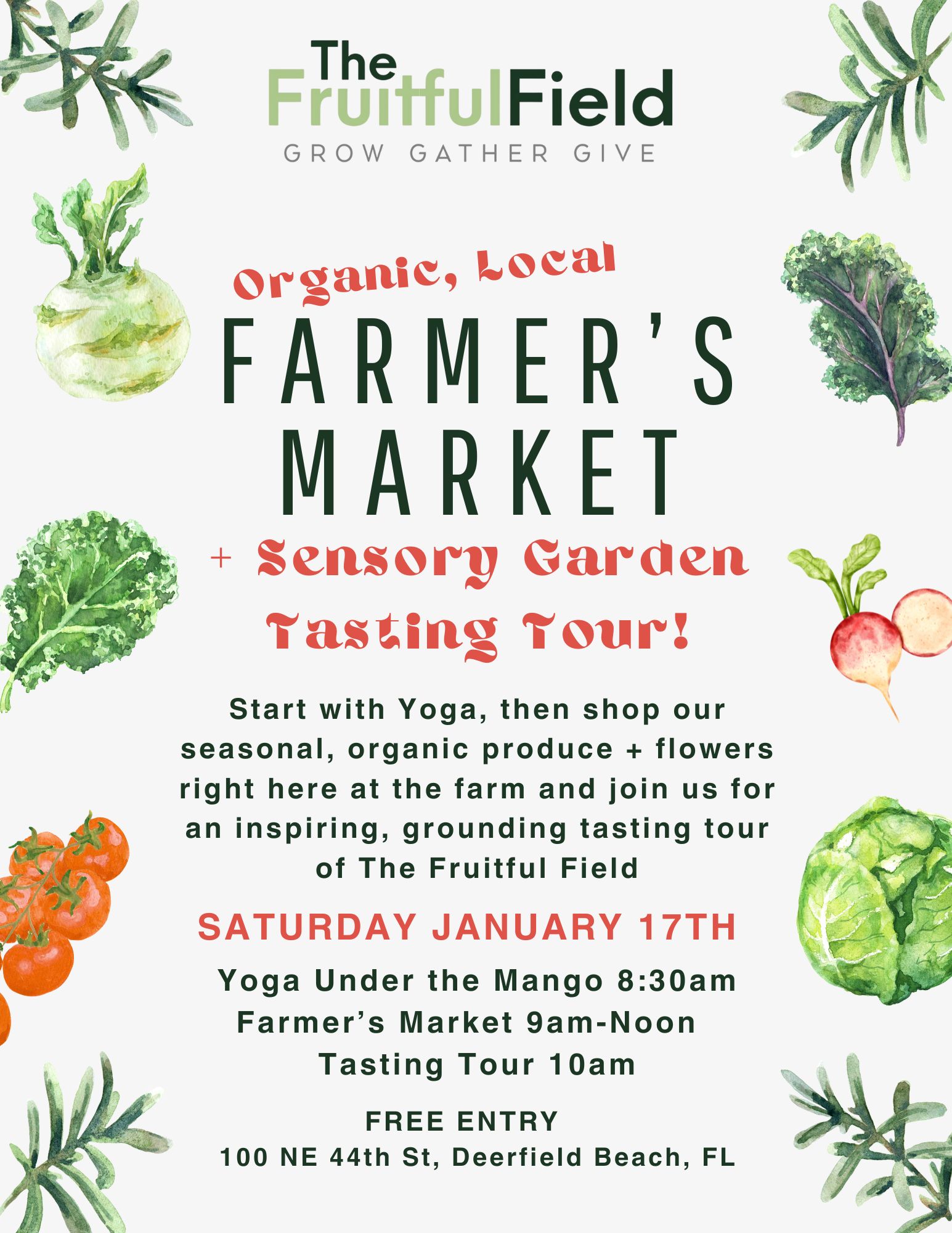 Monthly Organic Farmer’s Market + Sensory Tasting Tour – January 17th 9am- Noon w/ Yoga Under The Mango at 8:30am